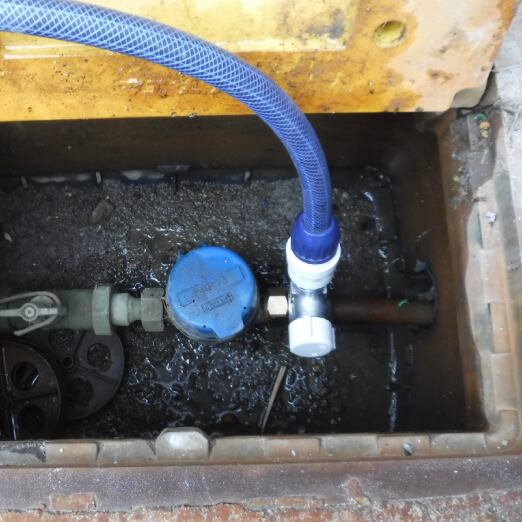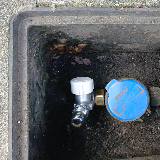 家屋解体時の水道管切断防止・飛散防止用散水の水確保に、配管加工不要で簡単設置可能な水道メーター用仮設水栓で、従来の時間・手間・コストを大幅に削減!